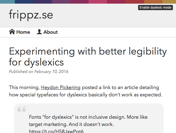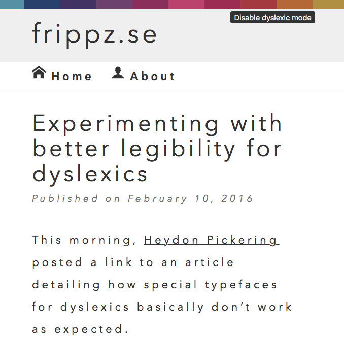 Right now, users would need to toggle the function on each page visit. Nothing is being remembered, even within the same session. Hey, it’s a beta. Also, I’ve eyeballed the typographic tweaks and would need feedback from real people with dyslexia, in order to improve this or to even validate that this is something viable.