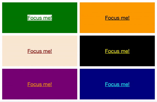 That’s it! See what’s going on? All boxes will get the class name themed-box, which declares that the background color and the color of the text should be set by the custom properties --background and --text respectively. Then, all we need to do is assign the values of those custom properties for each theme we create. Now, without any additional styling for focused links, we get the following: